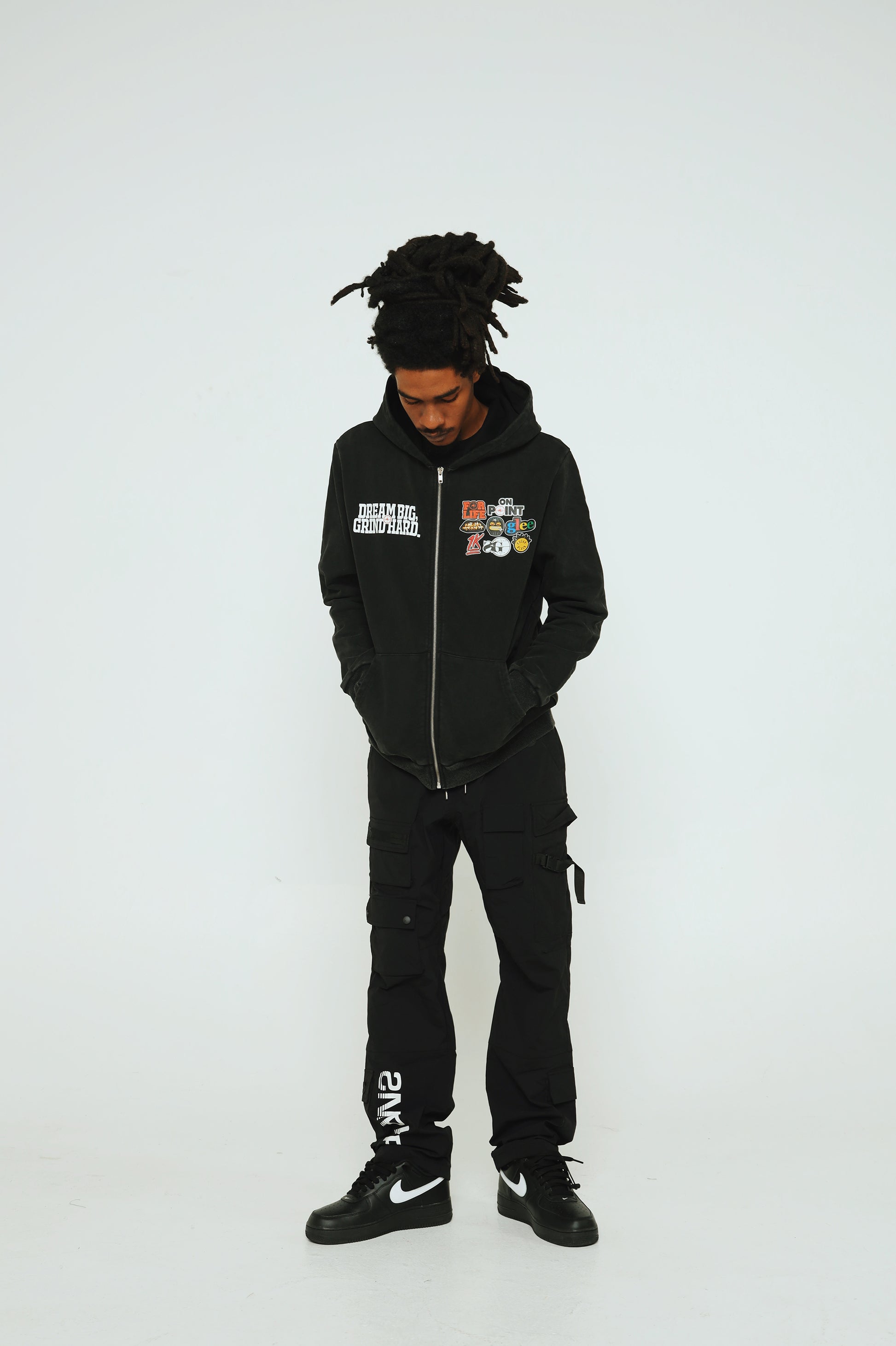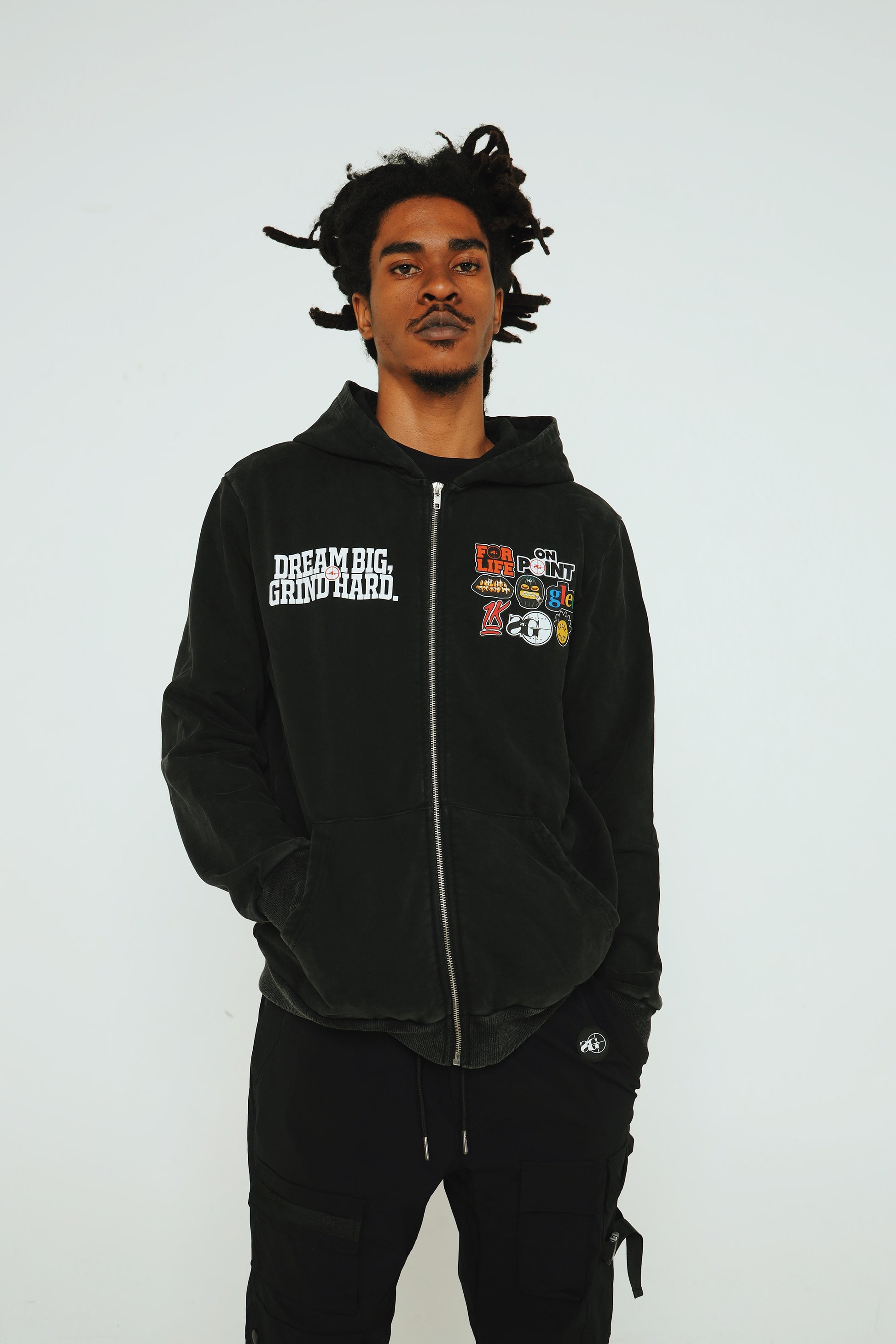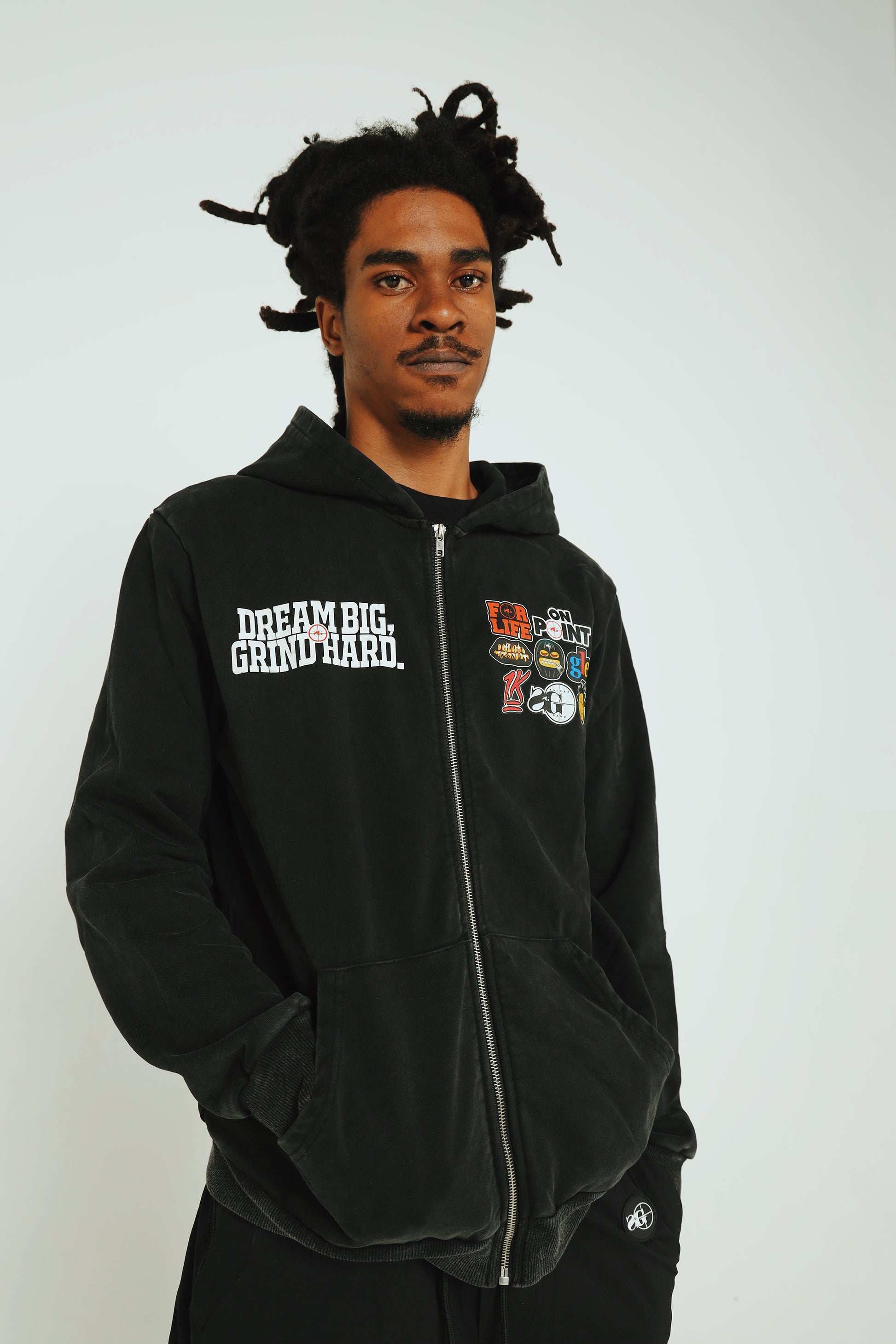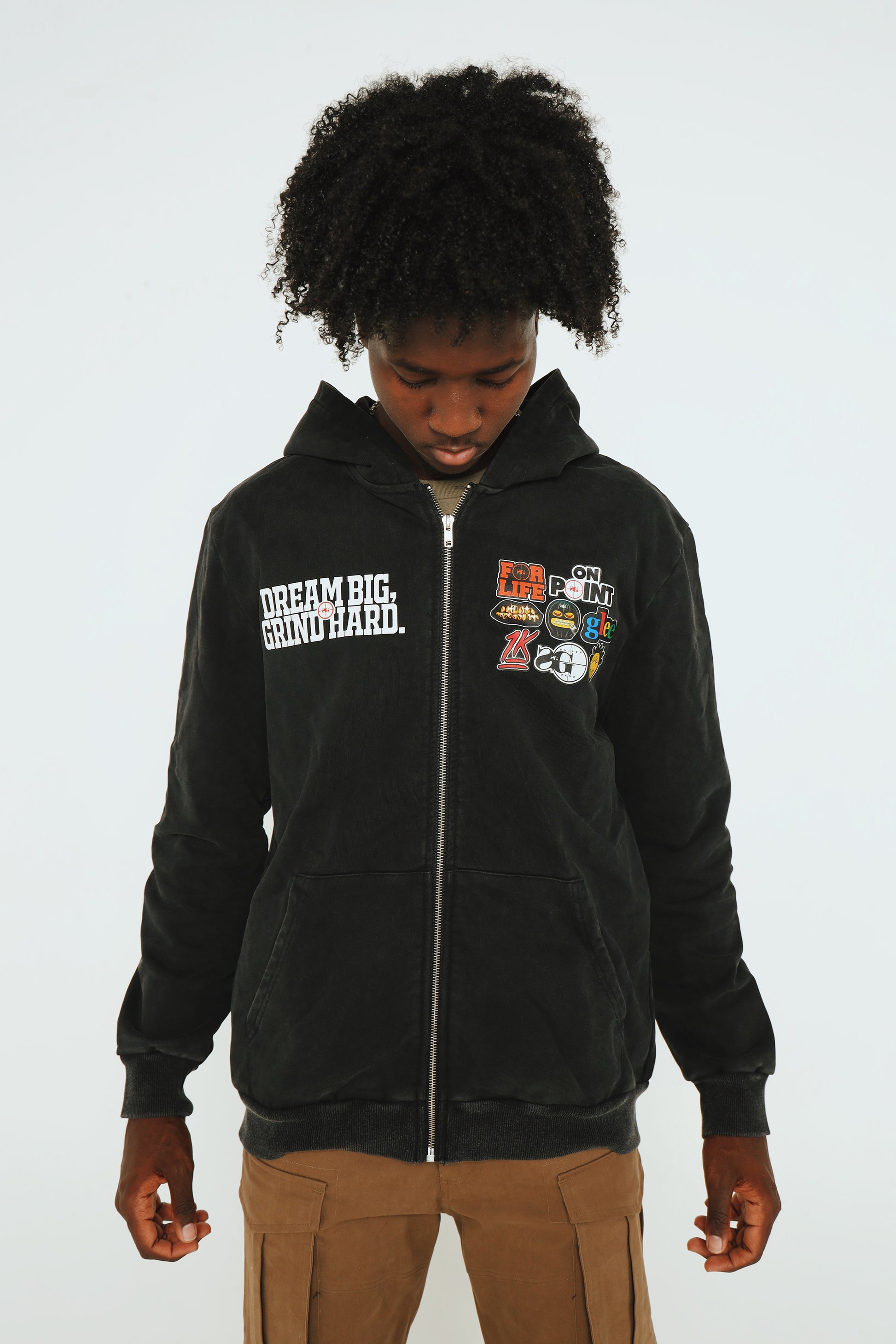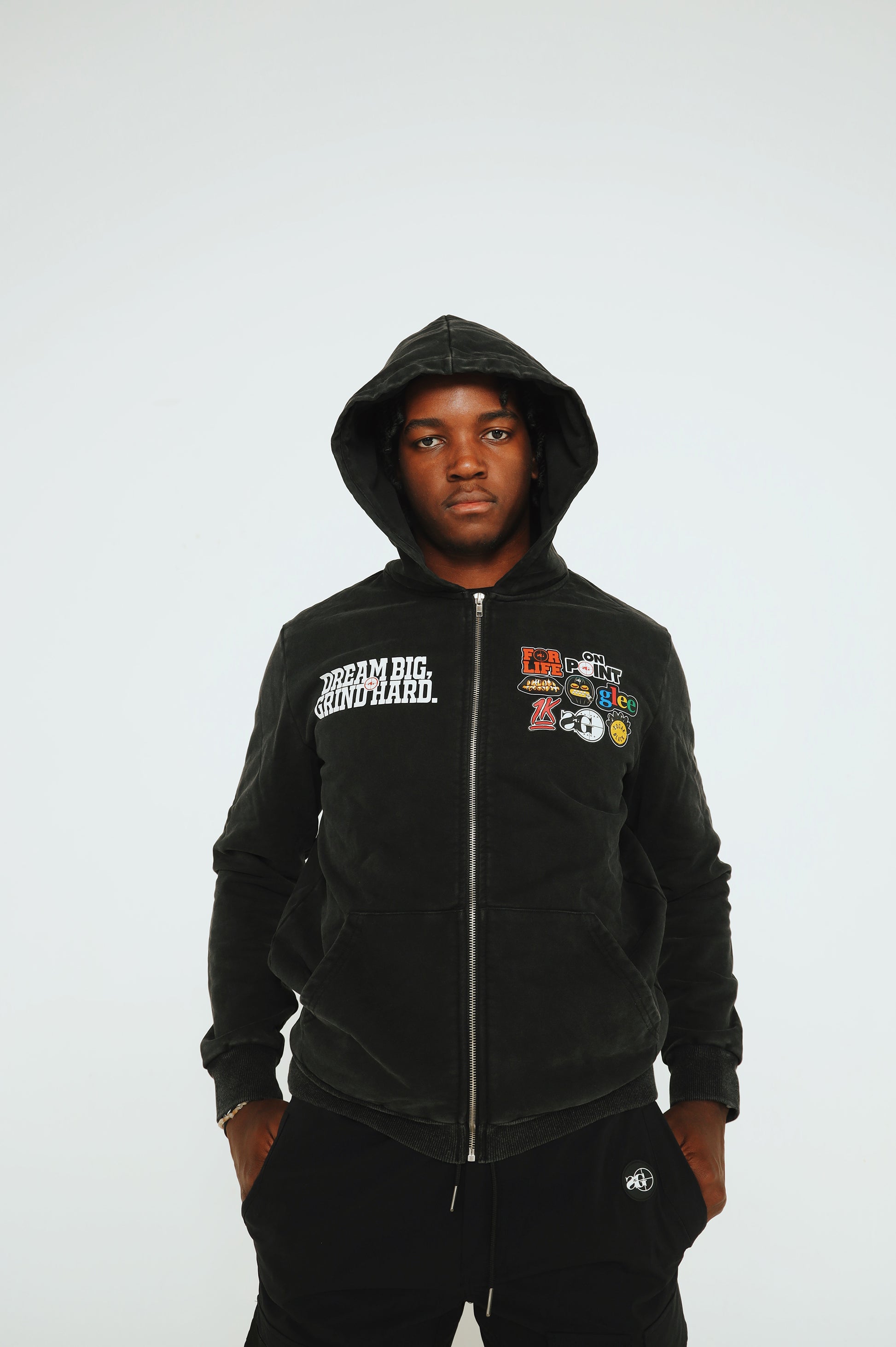 The new Sniper Gang “Dream BIG, Grind Hard” Hoodie is built for those who live with vision and move with purpose. Set against a rugged acid wash finish, this full-zip hoodie features the motivational mantra “Dream BIG, Grind Hard” on the left chest, balanced by a collection of bold Sniper Gang and Kodak-inspired patches on the right—each one telling its own story.